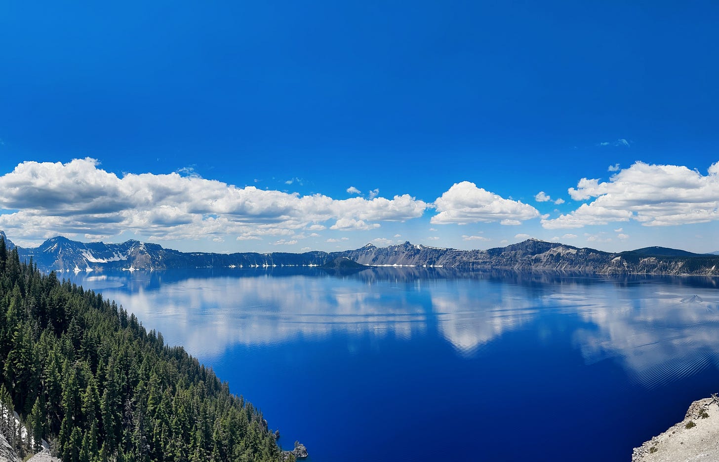 disregarding her fears, we drove down to crater lake and saw this deep and strange and scared basin, two thousand feet of rain and snowmelt sitting almost untouched in the 5-mile wide caldera of mount mazama. it was blue as a glacier, bluer than the sea. empty, still, and shoreless. no channels in or out. no hint, until you reach the steep and vacuous cliffside, that the lake is even there.